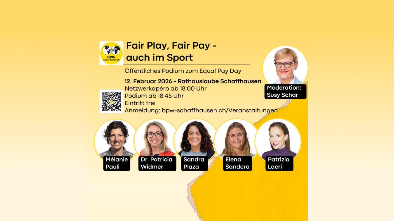Im Rahmen des internationalen Equal Pay Day* 2026 organisiert der BPW Club Schaffhausen am 12. Februar 2026 eine öffentliche Podiumsdiskussion in der Rathauslaube Schaffhausen.